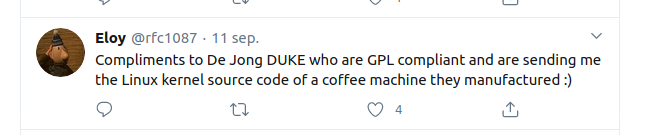 I was a member of the Free Software Foundation Europe back in 2010 and have donated many times to the Software Freedom Law Center / Software Freedom Conservancy (the thing Bradley always talked about on the Linux Outlaws Podcast) and at work I'm the goto guy whenever we get a GPL request for our coffee machines, so you might say I have a heart for open source. If anyone from the SFC or FSF or GPL violations.org is reading this and wants to do more with it, please send me an email.