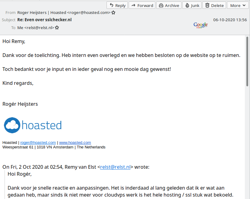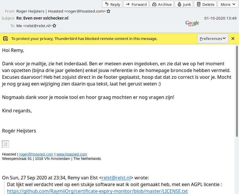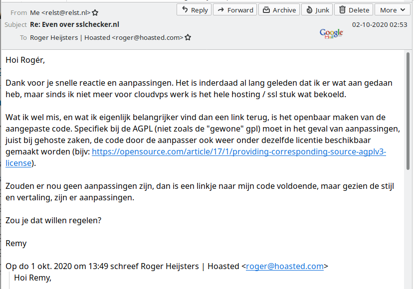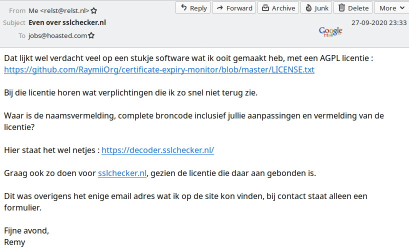 Five years ago I made a website that allowed you to put in a few domains and get an email when the SSL certificate was about to expire. No ads, no fuss, just an easy way for people to keep tabs on their sites without setting up their own monitoring like Nagios. As with all of my software, I released it under the GPL, specificaly the AGPL due to it being web based software. The AGPL differs from the GPL on one point, simplified, you have to release the source of any modifications you make under the same license, even when you host the software (not distribute) online. With the regular GPL, you don't have to release the source if you provide a modified version online, only if you distribute it.